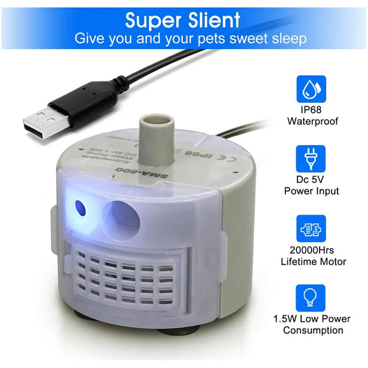 IP68 Water Fountain Pump for Stainless Steel Cat Fountain Cat Dringking Fountain Replacement Pump with USB Cable LED Lights